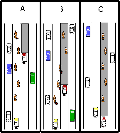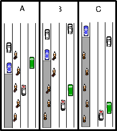 acest caz trecerea se face spre banda din stanga. Prima motocicleta care face trecerea creeaza spatiul necesar celorlale