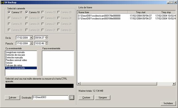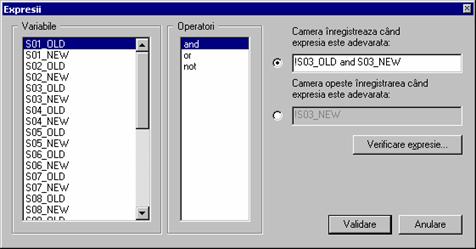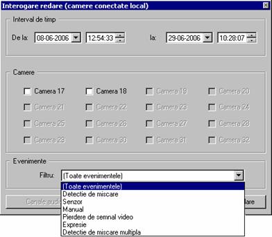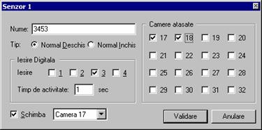 Astfel, daca pe camerele 9, 10, 11 sunt setate evenimentele de detectie de miscare atunci va sunt afisate doar camerele (dintre acestea) care detecteaza evenimentul asociat precum si fereastra de monitorizare in modul 1 cu selectie pe camera care a inregistrat evenimentul. Fereastra de mai sus ofera setarea de combinatii posibile pentru cele 2 evenimente, detectie de miscare si senzor: se poate gestiona alarmarea pe detectie de miscare, sau pe senzor, sau pe detectie de miscare sau senzor sau pe detectie de miscare si senzor. De remarcat este ca se pot face combinatii logice intre cei doi operatori (detectie de miscare, senzor). In exemplul de mai sus, se vor gestiona doar evenimentele de detectie de miscare pe camerele selectate. Pentru a reseta evenimentele de un anumit tip se vor folosi butoanele din partea dreapta jos a dialogului: