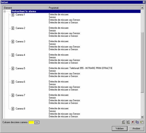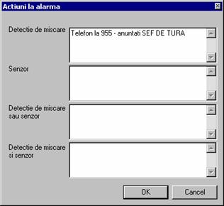 In acest mod se pot stabili instructiunile care vor fi urmate in caz de alarma. Acestea pot fi setate doar de catre utilizatorii care au acest drept. Pentru a modifica aceste informatii dublu - click pe camera respectiva si va este afisat meniul de definire a instructiunilor. Vor fi introduse toate informatiile referitoare la un eveniment specific. In exemplul de mai sus, se cere telefonarea la 955 cu anuntul "intrare prin efractie" precum si anuntarea sefului pazei la un anume numar de telefon. Aceste informatii vor fi afisate daca pe camera 9 (in exemplul de mai sus) a aparut o alarma.
