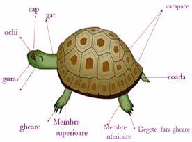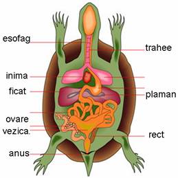 Alcatuirea corpului Corpul este acoperit cu placi osoase sudate intre ele , acoperite cu placi cornoase .; ele alcatuiesc testul , de aici si numele animalelor. Testul are rol in apararea corpului si este format din carapace si plastron . El are o deschidere anterioara pe unde intra si iese capul .In caz de pericol animalul se retrage in test .Membrele sunt scurte si asezate lateral , degetele avand gheare ascutite . Muschii membrelor sunt puternici deoarece suporta greutatea corpului. ; broasca testoasa paseste . |