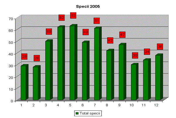 A mai trecut iata inca un an cu pasari ! Si acest an s-a dovedit fructuos in aripi si pene.Au fost observate peste 100 de specii (mai precis 101) cu un total de 26 492 de exemplare. Pe graficele alaturate se pot vedea efectivele si speciile observate in fiecare luna. Cele doua grafice anuale deseneaza o curba de forma colinara cu o amplificare maxima in lunile martie si aprilie (in perioada de pasaj), cu o usoara coborare si stationare in perioada de vara (speciile cuibaritoare) urmata de o scadere mai accentuata in perioada pasajului de toamna si apoi o relativa stationare in perioada hivernala cand pot fi observate speciile sedentare si oaspetii de iarna.