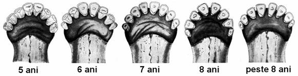 Referitor la modificarea dentitiei in raport cu varsta si la posibilitatea aprecierii varstei dupa acest criteriu, mentionez faptul ca atat inlocuirea dintilor de lapte cu dinti permanenti cat si uzura acestora, se realizeaza in limite foarte largi, de aproximativ 6-9 luni, in functie de precocitatea rasei si mai ales de natura alimentatiei.
