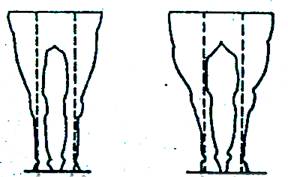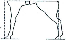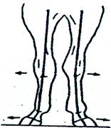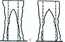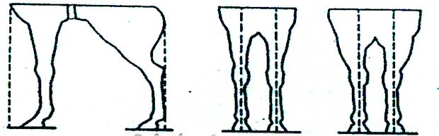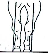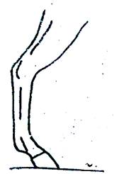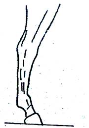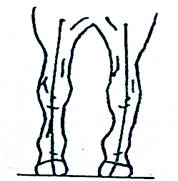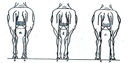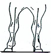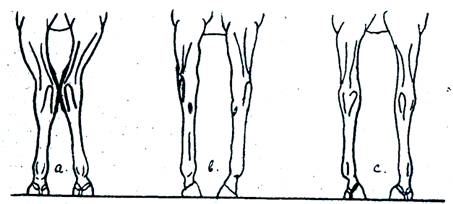 Privite din fata, deviatiile fata de aplombul corect sunt: larg dinainte, (Fig. 2. a.), stramt dinainte, (Fig. 2. b), inchis dinainte, genunchi de bou (Fig. 3. a), genunchi cambrat(Fig. 3. b), panard, canios.