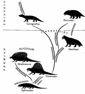 Figura 39. Principalele directii evolutive ale Pelycosaurilor si a Therapsidelor. |
