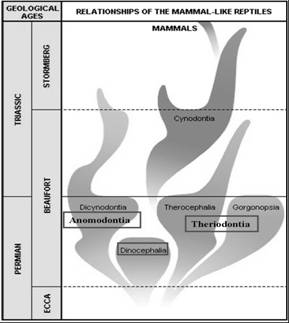 Figura 40. Relatiile dintre diferitele directii evolutive ale Therapsidelor.