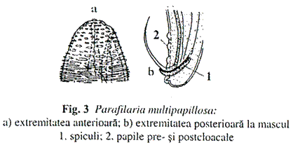 La ecvine paraziteaza Parafilaria multipapillosa (fam. Filariidae) (fig. 3). Masculul are dimensiunile de 2,8 3 cm lungime, prezinta 2 spiculi. Femela, de 4 7 cm, are vulva situata langa orificiul bucal. Ouale, ovale, cu coaja subtire, de 55/30 m, sunt embrionate in momentul pontei.