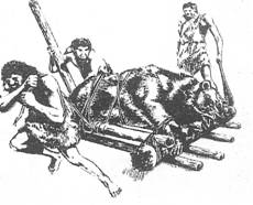 Cu muchiile ascutite ale pietrelor sfarimate omul reuseste sa-si faca topoare legindu-le strins la capatul unor bete mai groase. Lovind mereu cu ele in tulpinile arborilor, el ii doboara. Dar trunchiurile grele trebuiau aduse in alte locuri, trebuiau trecute peste obstacole, care chiar cind sint mici, nu pot fi cu usurinta invinse. Si de asta data omul s-a straduit sa gaseasca mijloace pentru a-si atinge telul, cu eforturi care sa nu-i depaseasca puterile. Trebuia infrinta o rezistenta pe care azi o definim simplu, cu un singur cuvint frecare dar pentru a carei invingere mai lesnicioasa omul a trebuit sa se straduiasca multi ani pina cind a gasit solutia recurgind la pirghii sau la formele rotunde, intr-adevar, trunchiurile de copaci puteau fi transportate mai lesne prin rostogolire, decit tirite cu miinile sau cu fringhii impletite din scoarta arborilor sau din liane. Dupa ce omul si-a dat seama de avantajul rostogolirii fata de alunecare, in mintea lui s-a nascut desigur ideea rotii, nascocire care a asteptat scurgerea mileniilor, dar care, practic, deschis cel mai important capitol in istoria transporturilor terestre.