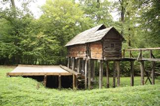 cu acoperis in doua ape, inaltata, de asemenea, pe piloti, deasupra apei, si