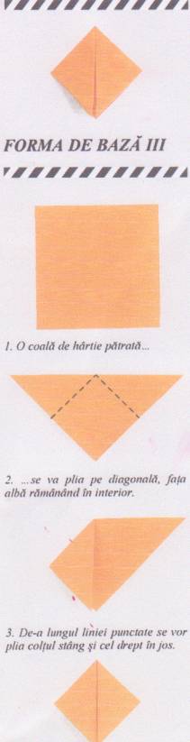 Tehnica origamii este o arta straveche de pliere a hartiei.Ea are la mai multe FORME DE BAZA,de la care se pleaca pentru a realiza modelele preferate.Forma de baza III,este punctul de plecare in realizarea PALARIEI,iar ind forma de PALARIE se realizeaza ,prin indoituri diferite PESTISORUL AURIU.
