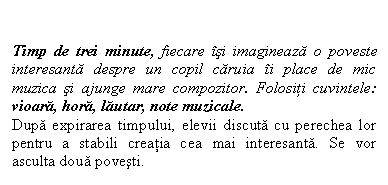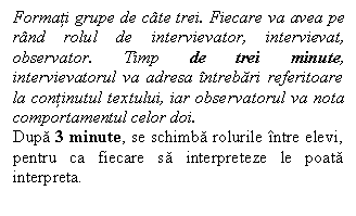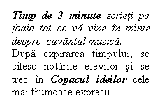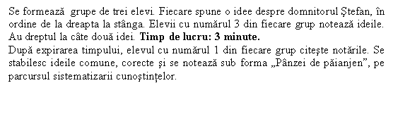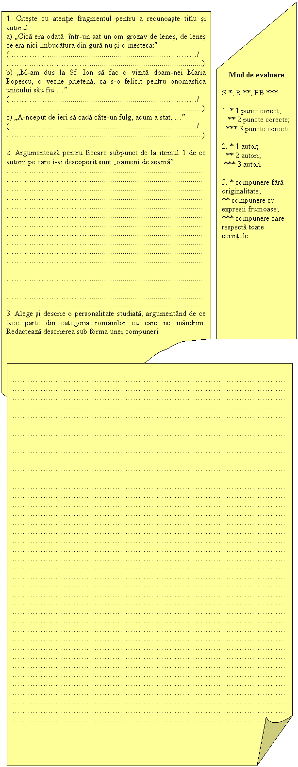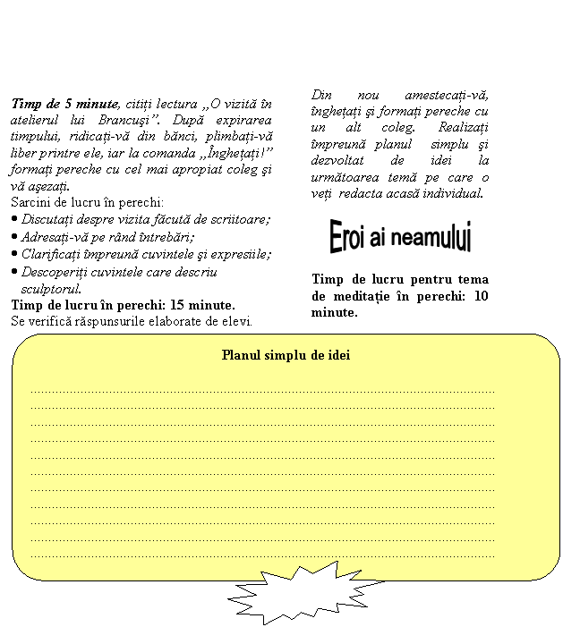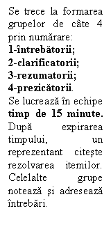 Dupa expirarea timpului, se citesc raspunsurile de cativa elevi, inclusiv notarile lor personale si se fac aprecieri colective.