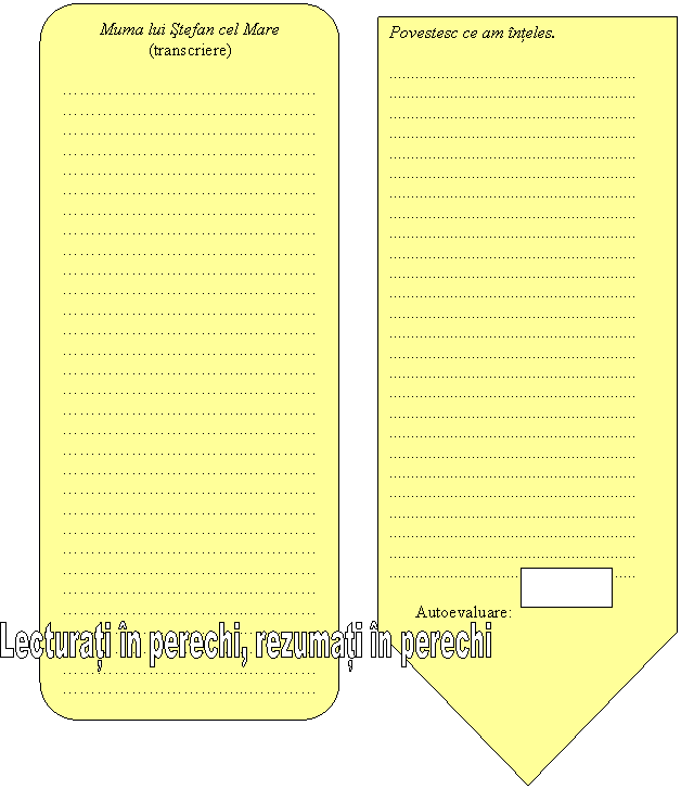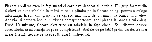 Elevii sunt grupati cate doi. Unul dintre elevi va citi un fragment, iar un alt elev va citi celalalt fragment timp de 5minute. Fiecare rezuma ce a citit, raspunde la intrebarile formulate de colegul sau, apoi se schimba rolurile. Dupa ce se verifica din nou unul pe altul, se realizeaza planul de idei in comun (simplu).