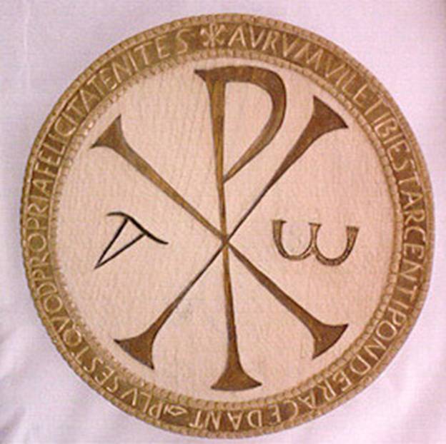 Se cunoaste lupta dintre Constantin cel Mare si Maxentiu de la Podul Milvius, in care i s-a aratat in vis lui Constantin cel Mare faptul ca "sub acest semn vei birui". Aceasta lupta este descrisa de poetul Lactantiu in lucrarea lui De mortibus persecutorum "Constantin a primit ordinul de a pune sa fie reprezentat pe scuturile soldatilor semnul divin si de a lupta astfel. El a facut ceea ce i s-a poruncit, a pictat litera X transversata de o bara al carui varf este usor intors si forma astfel monograma lui Hristos, apoi armata, aparata de acest nume sfant, a tras sabia pentru a lupta." Astfel se explica pasajul crucii de flacari din viziunea monogramei lui Hristos, care este in acelasi timp semnul ungerii si numele lui Hristos. Pe cer a aparut "prin acest semn vei invinge", Constantin cel Mare l-a adoptat, asigurandu-si certitudinea victorii. Potrivit lui Eusebiu, cu ocazia diferitelor batalii, Constantin cel Mare va purta semnul pe partea din fata a coifului. Cea mai mare parte din succesorii sai au inteles foarte bine mesajul si l-au adoptat la randul lor, monograma distingandu-se clar de celelalte stindarde. Numele dat semnului este labarum, acest fapt apare consemnat la Grigorie de Nazians (cca. 360). Incepand cu Constantin al II-lea labarum-ul va deveni mai frecvent pe monede. Se poate observa intre doi militari care il pazesc, sau se poate observa tinut in mana de imparat. Ajungand la apogeu, moda monogramei s-a impus pentru a simboliza in acelasi timp crucea si pecetea Mantuitorului.
