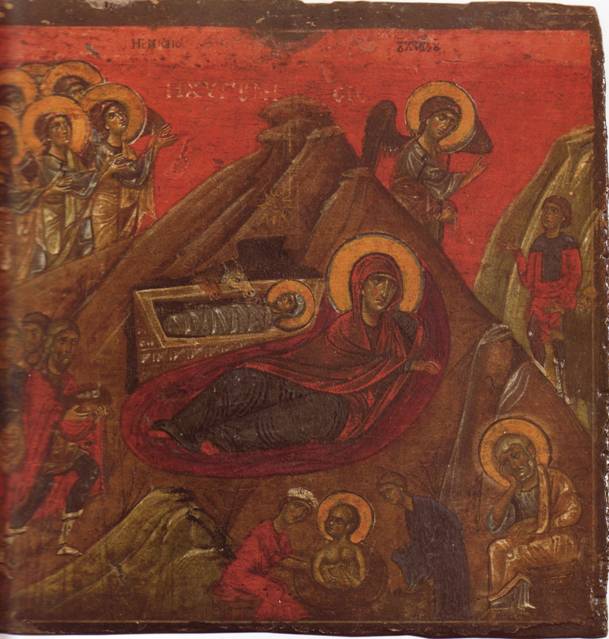 Fig.37 Nasterea Domnului Iisus Hristos, icoana pe lemn, Manastirea Vatoped, secolul XIV;