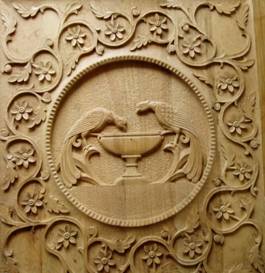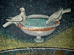 Imaginea porumbelului care bea dintr-un vas are un simbol euharistic: sufletul curat care bea din vinul continut in cupa. Dar se pare ca aceasta problema este mult mai complexa. Vasul din care uneori cresc plante, reprezinta Paradisul terestru, in mijlocul caruia se ridica Arborele Vietii. Porumbeii care vin sa guste din el sunt sufletele defunctilor care isi sting setea la acest izvor originar.