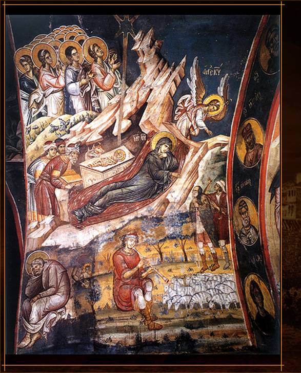Fig.55 Nasterea Domnului, Manastirea Vatoped. Sfantul Irineu de Lyon, a carui intreaga gandire se misca in jurul tainei Intruparii, spune "Si s-a aratat om la plinirea vremii si a cuprins, ca Cuvant al lui Dumnezeu, totul in Sine, cer si pamant. El a unit pe om cu Dumnezeu si a restabilit comuniunea dintre Dumnezeu si om"