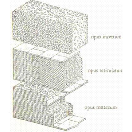 Desi romanii au folosit si simpla imbinare a blocurilor de piatra cioplite regulat, au preluat si tipul de zid grecesc numit emplecton (alcatuit din doua paramente legate intre ele din loc in loc cu ajutorul unor blocuri dispuse in cruce, golul dintre paramente fiind umplut cu pamant bine batatorit). Romanii insisi au inventat asa-numitul zid quadratum (un opus quadratum se obtine din imbinarea, cu ajutorul unor piese metalice-crampoane de fier prinse de piatra prin intermediul plumbului topit, a unor blocuri de piatra rectangulare care puteau avea aceeasi inaltime- isodomon sau cu inaltimi diferite-pseudoisodomon). Tehnica in opus quadratum se intalneste pe scara larga in perioada republicana si imperiala (de ex. Constructiile din Forul roman republican, teatrul lui Marcellus din Roma). Din secolul al II-lea a. Chr., se introduc noi tehnici de constructie prin inventarea mortarului-un amestec nou de apa, var si nisp (Vitruvius, II, V-VI; VII, I). Apoi, din veacul I a. Chr, din mixtura varului, cu apa, nisip si o cenusa de tip vulcanic (praful de Puteoli sau pozzolana) a rezultat o compozitie similara betonului care a permis introducerea curbelor tridimensionale in arhitectura, fiind folosit, in locul lemnului, si la boltiri iar, in domeniul constructiei de ziduri apare asa-numitul opus caementicium. Acest nou tip de zid, care necesita o imbracare exterioara- parament- din ratiuni estetice si pentru a-i spori rezistenta la intemperii, a cunoscut mai multe variante (Vitruvius, II, VIII): a. opus incertum (invelisul este din piatra sparta neregulat si prinsa direct in mortar- din sec al II-lea a. Chr.); b. opus reticulatum (cu paramentul in forma de retea alcatuit din blocuri romboidale egale prinse intr-un miez de zidarie de tip incertum-din sec. I a. Chr pana in sec al II-lea p. Chr.); c. opus testaceum sau latericium (unde blocurile de piatra din parament sunt inlocuite cu caramizi arse); d. opus mixtum (cu alternanta dinstre randuri de piatra dispuse in tehnica reticulatum cu randuri de caramida din testaceum-din veacul al III-lea p. Chr.); e. opus spicatum -in spice (se utilizeaza la pardoseli prin asezarea in spic -parchetarea- caramizilor).