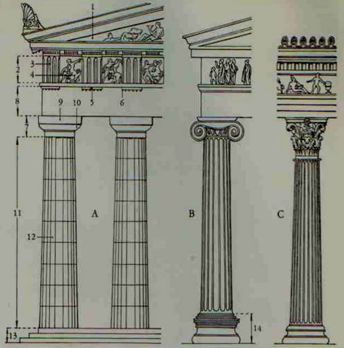 Fig. 2. Ordinele grecesti: legenda: 1-timpan; 2-friza; 3-triglifa; 4-metopa; 5-regula; 6-guttae; 8-arhitrava; 7-capitel; 9-abac; 10-echin; 11.fusul coloanei cu nervuri; 13-stilobat; 14-baza coloanei ionice