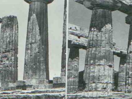 b.Ordinul doric, conceput dupa statura barbatului, nu are baza, coloana (cu diametrul mai mare in partea de jos) se sprijina direct pe podeaua edificiului-stereobat. Fusul ei format dintr-o succesiune de tamburi, are intre 16 si 24 de caneluri verticale iar capitelul se compune din echin -un trunchi de con cu baza mare in sus- peste care se suprapune abacul simplu (o lespede patrata). Deasupra capitelului, cu rol de grinda, se aseaza arhitrava, un singur bloc, iar peste aceasta se suprapune friza. In ordinul doric friza este o alternanta de metope (spatii destinate decorurilor figurative) si triglife (caracterizate prin trei santuri verticale). Sub triglife se scultau asa-numitele guttae- picaturi, forme geometrice in relief. Streasina sau cornisa este mult iesita in afara planului dat de coloane si era decorata pe margine cu antefixe (avand rol de burlane). La colturile acoperisurilor erau asezate acroterele, sferturi de sfera. Frontonul este triunghiul din fata si din spatele edificiului, format din cele doua pante ale acoperisului acoperit cu reliefuri a caror tematica depinde de natura si destinatia constructiei.
