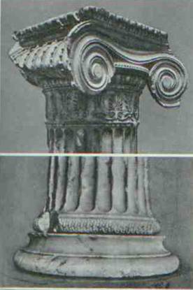 c.Ordinul ionic, inspirat de zveltetea feminina, are coloana prevazuta cu baza (alcatuita la randul ei din plinta si discuri concave (scotii) sau convexe (toruri) -doua forme principale sunt cunoscute: cu o scotie intre 2 toruri sau un tor intre 2 scotii), fusul mai subtire avand un numar de 20-54 de caneluri mai adanci decat la ordinul doric si capitelul al carui echin prezinta motive vegetale si o dubla voluta.Abacul are de asemenea motive vegetale. Arhitrava acestui ordin se realizeaza din trei blocuri suprapuse iar friza este un spatiul orizontal continuu, propice pentru reliefuri narative. Cornisa este asemanatoare cu cea dorica dar este decorata cu denticuli, astragale sau motive florale. Acest ordin are antefixe si acrotere.