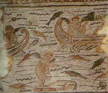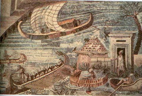Fig. Mozaic policrom, Villa Desenzano, sec al IV-lea p. Chr., tema alexandrina a pescuitului