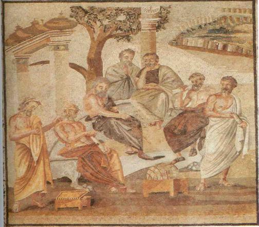 Fig. "Cei sapte intelepti", mozaic de la Torre Annunziata, langa Pompei, cca 100 a. Chr.. Muzeul din Neapole