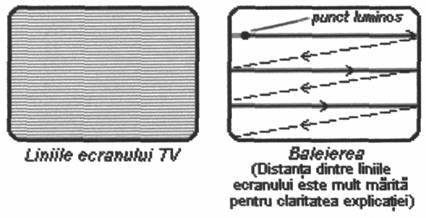 Fotograma video nu este asa. în acea cincizecime de secunda cât dureaza „proiectia” ei pe micul ecran, ea de fapt nu exista integral în nici o fractiune de secunda. Imaginea video se realizeaza prin deplasarea pe linii orizontale a unui fascicul luminos de electroni, care baleiaza ecranul (în franceza, balayer înseamna „a matura”) extrem de repede, astfel ca într-o cincizecime de secunda l-a parcurs tot, creând iluzia unei imagini complete, cam pe aceeasi baza fizio-optica datorita careia, daca rotim în întuneric o tigara aprinsa, privitorii au impresia ca vad un cerc.