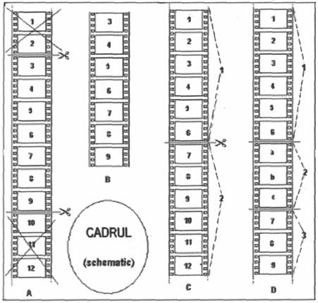În desenul schematic de mai sus (schematic mai ales pentru ca numarul de fotograme este mult mai mic decât în realitate), la „A”, de la fotograma 1 si pâna la fotograma 12 avem cadrul asa cum s-a filmat, de la pornirea pâna la oprirea aparatului/camerei. Realizatorul apreciaza ca primele doua fotograme si ultimele trei nu sunt necesare si procedeaza la eliminarea lor prin taiere. Ceea ce a ramas (,3”) este un cadru finit, bun de montat. Daca, însa, realizatorul considera ca acel cadru filmat initial („A”) e prea lung si ca trebuie intercalat ceva, el va taia dupa fotograma 6, dupa cum sugereaza desenul „C”. Inserând între fotograma 6 si fotograma 7 un alt cadru, reprezentat schematic în „C” prin fotogramele a,b,c, cadrul initial „A” (v. desenul „D”) a devenit doua cadre: „1” si „3”.