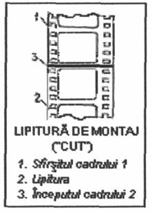 Modul cel mai obisnuit, cel mai „firesc” si cel mai des utilizat de înlantuire a cadrelor este cel prin taietura (lipitura) de montaj („cut”). Aceasta înseamna juxtapunerea, alaturarea (prin montaj) a unui cadru de cel anterior, fara nici un fel de artificiu, astfel ca, pe ecran, imaginea unuia va înlocui instantaneu (adica într-o 48-ime de secunda) imaginea celuilalt - cu alte cuvinte, dupa ultima fotograma a primului cadru va urma imediat prima fotograma a celui deal doilea.