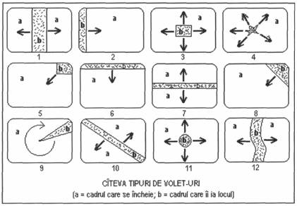 Volet-urile sunt modalitati geometrice de înlantuire a cadrelor, prin „împingerea în afara” a cadrului care se sfârseste si înlocuirea sa cu urmatorul. Câteva din cele „clasice” sunt reprezentate în desenele de mai jos: 1: „usa”; 2: „usa glisanta”; 3: fereastra care se dilata; 4: steaua care explodeaza; 5: coltul care înainteaza; 6: storul; 7: oblonul; 8: linie oblica; 9: „acul de ceasornic” (si în imagine); 10: obloane pe diagonala; 11: cercul care creste; 12: meandre în expansiune.