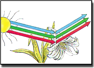 Un subiect colorat, cum ar fi o frunza pare a fi verde pt ca in momentul in care lumina alba o atinge, frunza reflecta doar undele de lumina verde si le aboarbe pe celalalte.