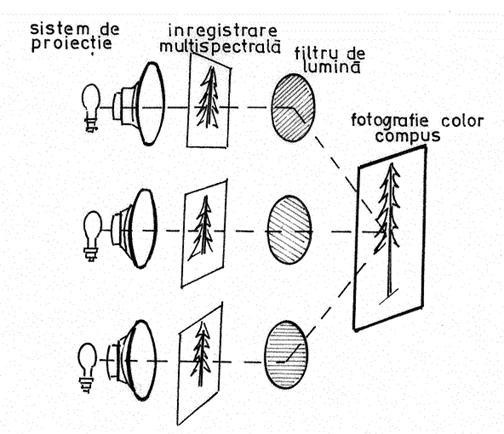 Acest procedeu presupune initial inregistrarea multispectrala, in alb-negru a obiectului in trei benzi reprezentative din vizibil si infrarosu apropiat (fig. 19). Copiile pozitive se proiecteaza simultan, printr-un sistem multiplu si se combina optic intr-o