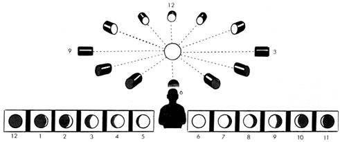■ 6H/1V: iluminarea de sus – iluminarea din acest unghi netezeste vârful capului si da umerilor proeminenta. Fata este aproape luminata, exceptie facând capul întors în sus, când o lunga umbra a nasului se va raspândi peste partea mai joasa a fetei. Acesta este un unghi urât de iluminare cu putine valori artistice.