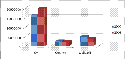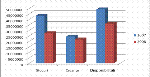 Se observa o scadere a stocurilor cu 36.67% in 2008 fata de 2007, o scadere a creantelor cu 10.84% dar si o scadere a disponibilatilor banesti cu 26.68%. Diminuarea continua a disponibilitatilor afecteaza lichiditatea si capacitatea firmei de a face fata obligatiilor banesti si investitiilor viitoare.