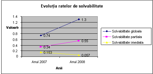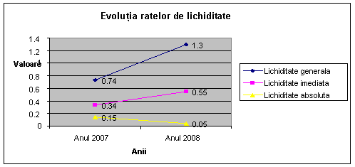 In anul 2007 indicatorul Lichiditate generala este subunitar ceea ce inseamna ca lichiditatile sunt mai mici decat exigibilitatile potentiale. Aceasta se datoreaza faptului ca datoriile exigibile pe termen scurt nu sunt acoperite, in principiu, de activele circulante, iar fondul de rulment are valoare negativa. In anul 2008 indicatorul are valoare supraunitara si este expresia unui fond de rulment care ii permite intreprinderii sa faca fata incidentelor care apar in miscarea activelor circulante sau unor deteriorari ale valorii acestora. Cu cat aceasta rata este mai mare de 1 cu atat intreprinderea este pusa la adapost de o insuficienta a trezoreriei care ar putea fi determinata de rambursarea datoriilor la cererea creantierilor.