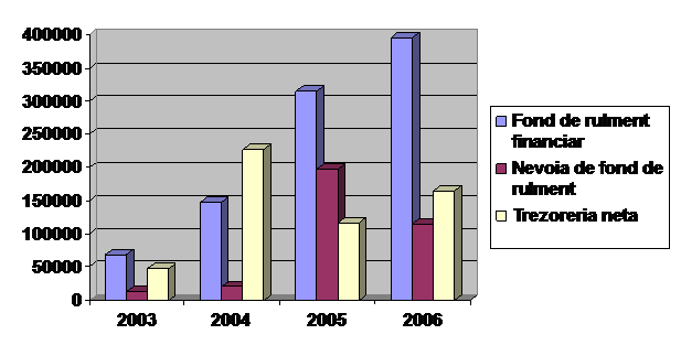 Fondul de rulment financiar in perioada analizata inregistreaza valori pozitive si in crestere de la un an la altul, ceea ce inseamna ca resursele permanente finanteaza integral alocarile permanente, ramanand si un surplus pentru finantarea unei parti a activelor circulante. Acest fapt este consecinta cresterii capitalurilor permanente, in conditiile mentinerii activelor imobilizate nete la aproximativ acelasi nivel pe primii 3 ani si o triplare a acestora in ultimul an