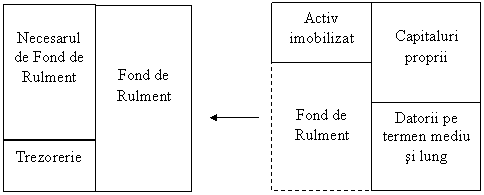 Rezulta din acest caz, ca mijloacele permanente trebuie finantate din capitaluri permanente (capitalurile proprii si datoriile pe termen mediu si lung). Excedentul de capitaluri permanente fata de activul imobilizat se numeste Fond de Rulment. Acest excedent trebuie sa acopere Necesarul de Fond de Rulment al Exploatarii, care asa cum am vazut, reprezinta un mijloc permanent. Existenta unui sold conduce la o trezorerie pozitiva, care va putea face fata variatiilor Necesarului de Fond de Rulment al Exploatarii: