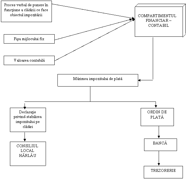 Biroul financiar-contabil, depune la Consiliul Local Harlau, declaratia de impunere privind stabilirea impozitului pe cladiri. Prin ordin de plata se achita valoarea impozitului prin Banca la Trezorerie sau direct prin contul deschis la Trezorerie.