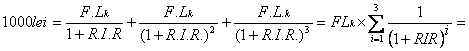 De exemplu, o investitie de 1000 lei are trei valori estimate (k), ale fluxului de lichiditati (FL) anual, pe durata de 3 ani: 210 lei, 438 lei, 711 lei.