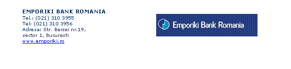 Emporiki Bank - Romania, filiala din Romania a Emporiki Bank of Greece, a fost infiintata ca persoana juridica romana, avand deschiderea oficiala in septembrie 1999. Actionarul majoritar al Emporiki Bank - Romania , cu peste 98% din capitalul bancii, este Emporiki Bank of Greece, banca ce a fost infiintata in anul 1907 sub numele de Commercial Bank of Greece si ale carei actiuni sunt tranzactionate la Bursa din Athena din anul 1909. In prezent, Emporiki Bank este una din cele mai mari banci comerciale din Grecia din punct de vedere al activelor si al retelei de sucursale, detinand in aceleasi timp si o retea de filiale in Germania, Marea Britanie, Romania, Bulgaria, Georgia, Armenia si Albania.