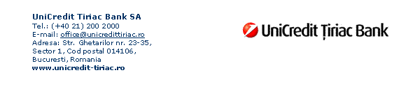 UniCredit Tiriac Bank este o banca universala ce ofera produse si servicii calitative la standarde internationale atat persoanelor fizice, companiilor mici si mijlocii, cat si marilor corporatii multinationale din Romania. In plus, clientii lor beneficiaza de toate avantajele oferite de o retea extinsa, la care se adauga avantajul cunoasterii pietei locale si cel al apartenentei la un important grup bancar.