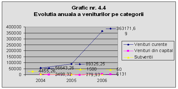 Se poate observa ca veniturile curente au crescut in anul 2006 in cea mai mare proportie, cu aproximativ 312000 lei. Evolutia anuala a executiei bugetare a veniturilor curente ale bugetului local pastreaza, in linii mari, evolutia anuala a executiei veniturilor totale, datorita faptului ca veniturile curente reprezinta cea mai mare parte (peste 90%) din veniturile totale. De remarcat este ca se mentine acelasi an de varf de incasari (anul 2006), precum si anul cu incasarile minime (anul 2004).