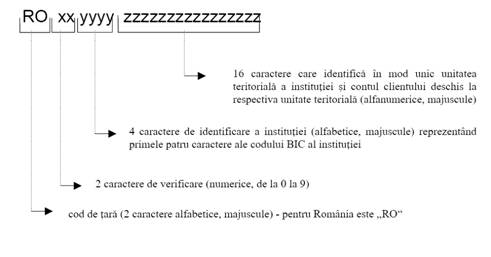 Structura codurilor IBAN atribuite in Romania de institutii conturilor clientilor lor consta intr-un sir de 24 caractere alfanumerice si este prezentata mai jos: