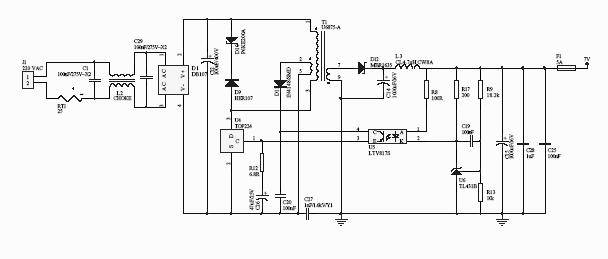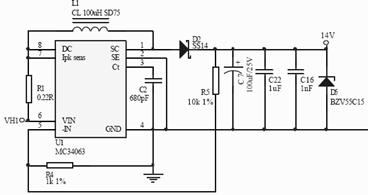 Se utilizeaza un convertizor de impulsuri tip TOP 224Y. Filtrul L2 si condensatorul C1 slujesc la filtrarea perturbarilor de la convertizorul de impulsuri catre reteaua de 220V.