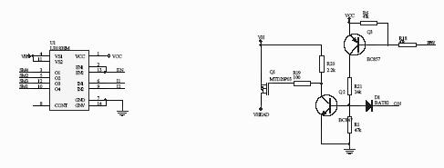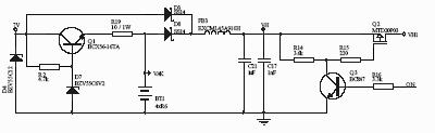 Circuitul de alimentare a bateriei de acumulatoare este realizat in baza tranzistorului Q1, iar rezistorul R19 determina curentul de incarcare. Cenerdiod D7 asigura pragul de incarcare. Cu tranzistorul Q2 se formeaza tensiunea pentru capul termic al imprimantei.