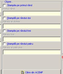 La apasarea butonului "Citire din ACEMF", in rubricile acestui grup se afiseaza informatia din casa de marcat, precum si faptul ca tiparirea acestora este permisa sau nu. Daca se doreste ca un rand sa apara pe bon, trebuie bifat Check Box-ul respectiv. Daca toate randurile pentru reclama sunt active, grupul va arata in felul urmator: