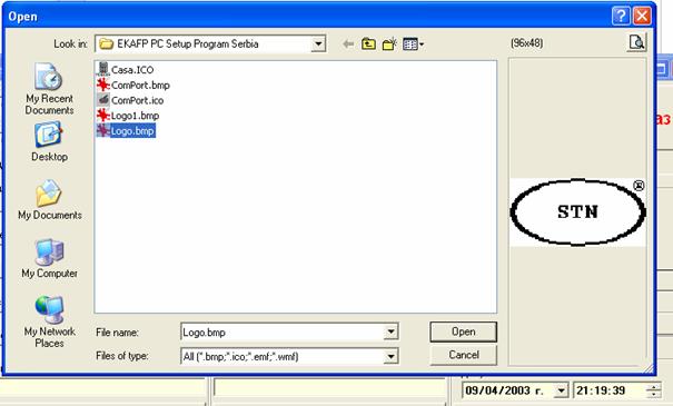 La apasarea butonului "Citire din ACEMF", in rubrica acestui grup se vizualizeaza informatia citita din casa de marcat despre logotipul grafic de reclama, care se tipareste pe fiecare bon de casa eliberat de catre aparat, precum si daca tiparirea lui este permisa. Daca logo-ul nu are permisiune de tiparire, trebuie sa se efectueze clic pe Check Box-ul "Stampila pe logotip , dupa care se poate inregistra logotipul. Prin apasarea pe butonul "Incarcarea logotipului din fisier", care, intre timp, a devenit accesibil se poate aduce un logotip creat anterior. Dupa apasarea acestui buton, pe afisaj apare caseta de dialog pentru selectarea unui fisier, care arata in felul urmator: