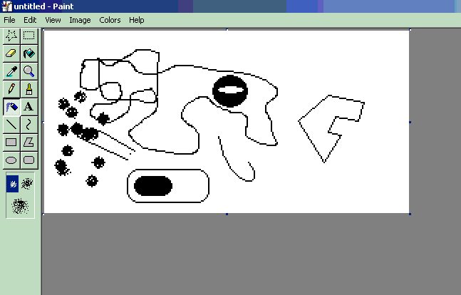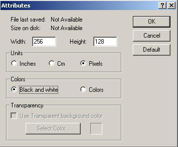 Parametrii trebuie sa fie inscrisi, asa cum este aratat in figura de mai sus, adica Width = 256, Height = 128, Units - Pixels, Colours - Black and White. Dupa aceea se apasa butonul "OK". Suprafata de lucru are astfel dimensiunile si parametrii necesari. Urmeaza crearea logotipului dorit cu ajutorul instrumentelor de pe bara din partea stanga a ferestrei de baza a programului: