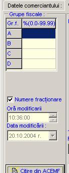 La apasarea butonului "Citire din ACEMF", in rubricile acestei grupe se afiseaza informatia despre unitatea comerciala si comerciant. Observatie: Toate rubricile in care se introduc informatii alfanumerice urmaresc automat sa se introduca numai caracterele permise (numai litere, numai cifre sau cifre si litere impreuna), precum si ca informatia introdusa sa aiba numarul maxim de caractere permise. Aceasta observatie se refera la toate grupele de informatii ale programului prezentat in acest manual. Pentru usurinta, la descrierea fiecareia dintre rubrici se va indica setul de caractere permise si lungimea maxima a informatiei introduse, precum si apartenenta ei la "Parametrii de sistem" sau la "Parametrii de utilizare" - adica de inscris o singura data sau cu posibilitatea de modificare de nenumarate ori.