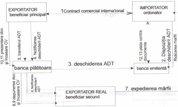 Transferul AD originar de catre primul beneficiar in favoarea beneficiarului secund se face intotdeauna prin inermediul bancii desemnate sa plateasca, sa accepte, sa negocieze, indicate in ADT initial. Derularea documentelor prin aceeasi banca are doua efecte. In primul rand permite beneficiarului principal sa inlocuiasca facturile beneficiarilor secunzi fara sa depaseasca valoarea acreditivului originar, iar daca apar diferente sa si le insuseasca, sa solicite beneficiarului secund unul sau mai multe documente suplimentare (care in relatia initiala nu apar), cum ar fi certificatul de origine in cazul unui beneficiar secund din alta tara, pentru scutirea de taxe vamale etc.