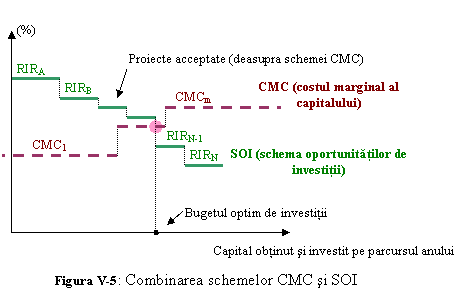 De asemenea, graficul scoate la iveala un aspect foarte important, si anume: costul capitalului utilizat in procesul de stabilire a bugetelor de investitii (discutat la punctul IV.2.), este determinat de fapt, prin intersectia graficelor CMC si SOI. Daca se utilizeaza rata costului capitalului valabila pentru punctul de intersectie, atunci firma va lua decizii corecte de acceptare sau de respingere pentru proiectele de investitii, iar nivelul sau de finantare si de investitii va fi optim. Daca firma utilizeaza orice alta rata a costului capitalului, bugetul sau de investitii nu va fi optim.